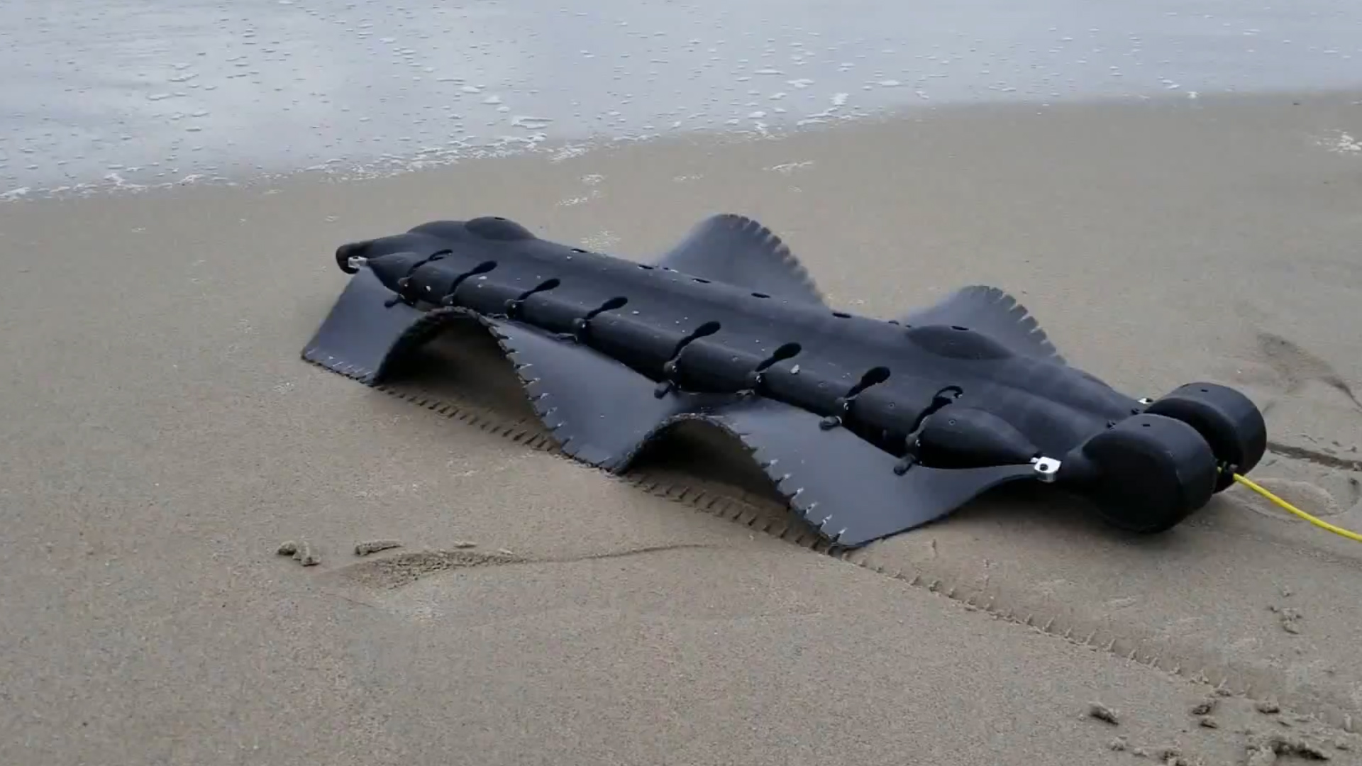 这款模仿了鳐鱼或鱿鱼的仿生机器人不仅仅能在水里自由穿行,还在陆地上走出了蛇的妖娆,Velox无论是什么地形,都通过控制飘带进行波浪形运动提供前进动力。