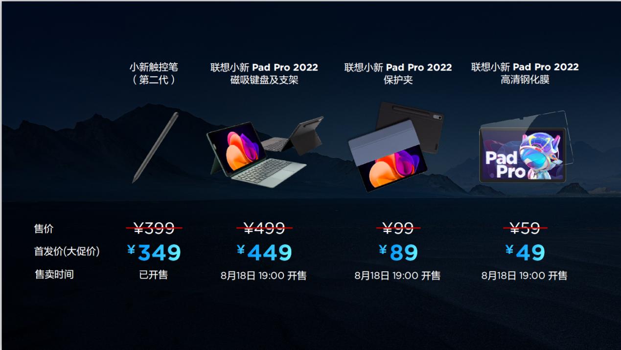 与小新Pad Pro 2022搭配使用的联想小新Pad Pro 2022磁吸键盘及支架首发价449元;联想小新Pad Pro 2022保护夹首发价89元;联想小新Pad Pro 2022高清钢化膜首发价49元。小新触控笔(第二代)大促价349元,目前已经在火热售卖中。