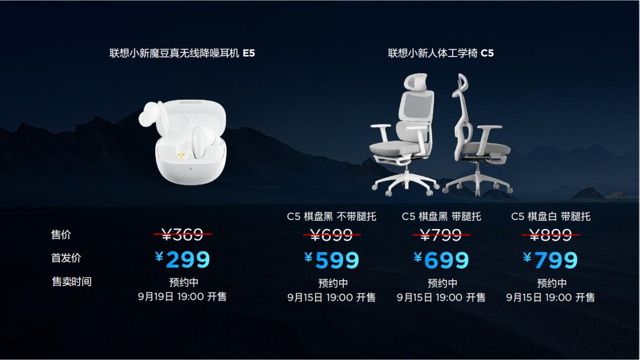 联想小新人体工学椅C5目前有三款可选,棋盘黑不带腿托款首发价599元;棋盘黑带腿托款首发价699元;棋盘白带腿托款首发价799元。联想小新魔豆真无线降噪耳机E5首发价299元。