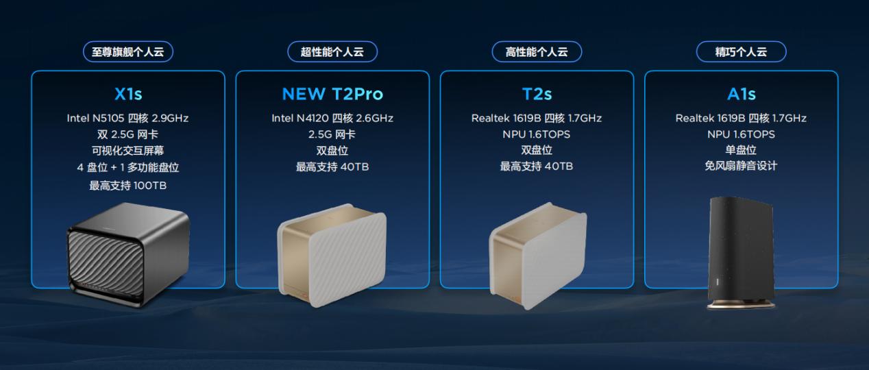 个人云家族全面焕新,共同守护数据资产除发布旗舰款联想个人云存储X1s外,联想个人云存储家族产品也在此次发布会上得到了全面升级。采用Intel N4120四核芯片和2.5G网卡的联想个人云存储NEW T2 Pro,性能得到大幅度提升;采用Realtek 1619B四核芯片,并新增独立NPU的联想个人云存储T2s和联想个人云存储A1s也都拥有出色的AI计算能力,四款联想个人云存储产品共同为用户带来高效、安全的数据守护能力。