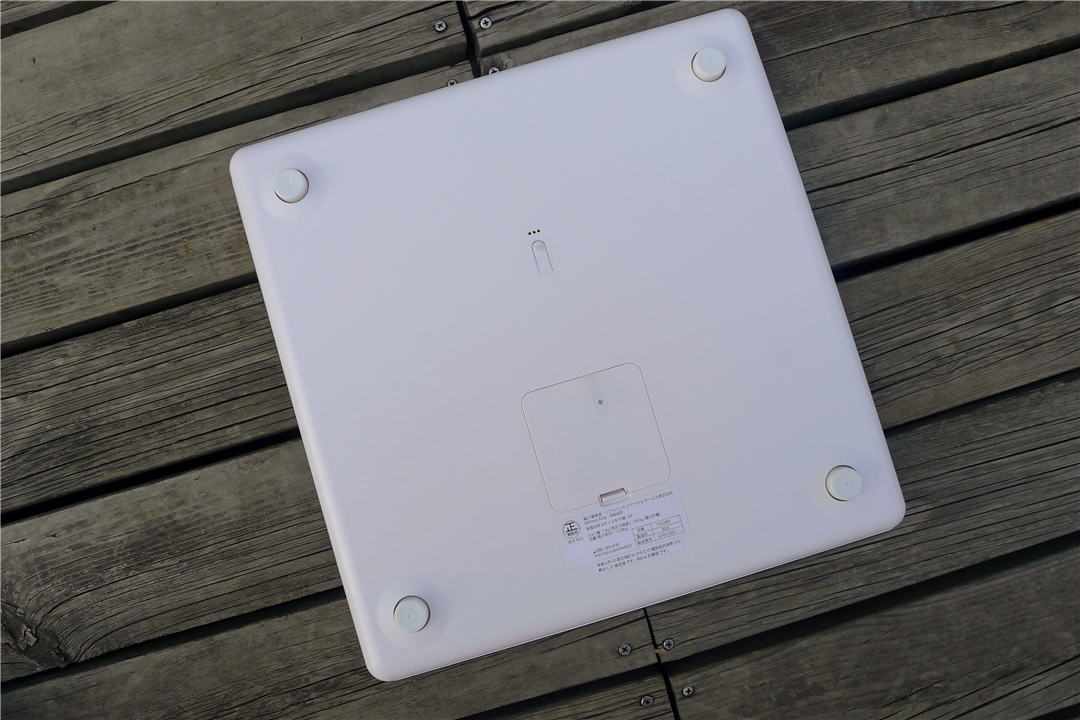 四个角上的垫脚,也是体重传感器所在的部位。从称的边角看去,称的四周都进行圆润化处理,做工也相当优秀。