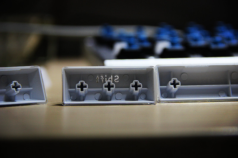看键帽可以看到长键是有三颗十字固定轴凹槽的,而非支撑杆式的卫星轴。做工优秀,透光度极好。但是这款是无背光灯版,所以看着键符就基本都是黑色的。