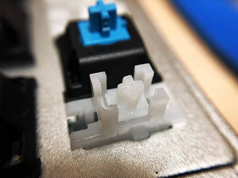 键帽内由三条固定筋连接三个键帽壁,此款键帽采用双层设计,内层为纯白,键符为镂空的,最外层就是水晶层,也是非常怕刮蹭的透明层。手感非常顺滑,无任何毛刺毛边。