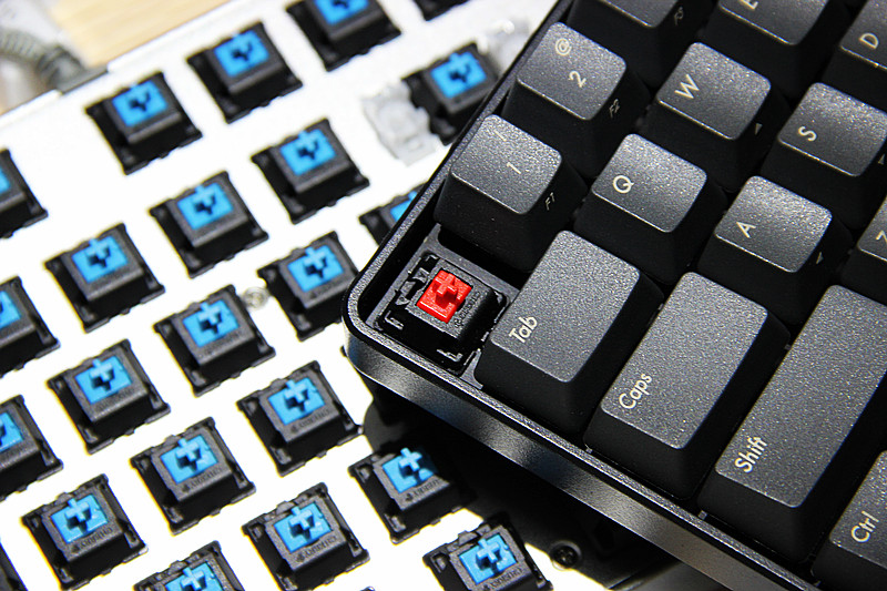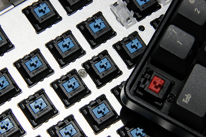 随便用手卸一个键帽,轴体方面采用发烧友的信仰cherry青轴。机械键盘常用轴体基本分为:黑轴、红轴、茶轴、青轴,压力克数也是从黑到青越来越重,段落感也是逐渐增强。黑红常用于游戏无段落感、青轴最适合打字段落感明显、茶轴介于两者之间。笔者最喜欢的轴体手感为青轴,虽然长时间使用手指会略感疲劳,不过,青轴所发出的清脆声音简直令人无法抗拒,甚至是上瘾。但是长时间游戏还是要使用黑红轴,因为黑红轴的触发键程相对更短,键程短就意味着更快的相应速度,所以,游戏使用黑红比较好。除了常用的四大轴体,Cherry还生产过一些比较小众而且限量的奶轴、绿轴、灰轴、白轴等等,搭载了这些轴体的机械键盘大多是高端限量版、纪念版的键盘,都是装在军火箱中进行售卖的,有的甚至一把难求需要买黄牛货。可以从轴体看出,机械键盘的水有多深,入坑谨慎啊。