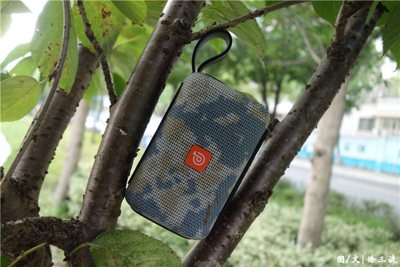 从外观上我们就可以看到这款产品主打的迷彩色,和户外两字更搭,外观材质上采用的是编织的外壳材质,更有个性,同时迷彩色也更有野性,符合户外的定位,同时内部也采用的是360度环绕音效的喇叭腔体设计,让声音全方位自然流出,同时还搭载了强劲震撼的低音振膜,能够在播放音乐的时候产生激情澎湃的低音,让你能够随时都能聆听动人的音质。