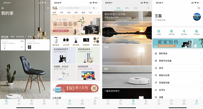 ▲这款米家app已经非常熟悉了,跟小米合作的智能家居、智能设备,都可以添加进行操作,首页就是您智能家居添加过的设备,随时都可以连接进行智能互联。有品种有售各类智能设备,手机、家电、居家、智能、饮食、餐厨、服饰、鞋包、笔记本、影音等。智能页面中有推荐的智能应用特殊技能,各种一键控制,还有我的习惯操作,和日志。在大界面我的中,可进行个人资料维护、帐号绑定、共享设备、组件、蓝牙网关、产品百科、设置等相关辅助。相信每个喜欢数码的玩家,对app操作基本都不会陌生。
