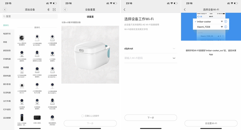 ▲既然想操控饭小二,那就必须先把饭小二添加到app中,在添加设备中,找到厨房电器后,选择饭小二煮饭机器人单击后,长按饭小二盖板上的配网按钮3秒,确认打开后,输入wifi密码,然后再到手机设置中的无线网选项中,添加imibar-cooker-mbihr_miap3462wifi名单击后会成功连接,这就是饭小二的配网过程。在连接中需要手机和饭小二相互接近,成功后,选择饭小二操作的场景。