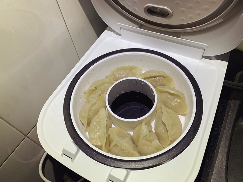 ▲饭小二准备首次米饭成熟期焖至过程,第一步倒米,打开米仓盖子倒入即可。还可以选择各种米种如:东北米、丝苗米、泰国香米、稻花米、五常大米等。米种选择完了,再根据几个人就餐选择米量,可以吃几碗,就选择几碗,饭小二加的量非常的准哦,正好三个人吃。饭小二会自动加入适量的米量。还有口感,是偏硬、适中、偏软。而我这时候就想吃怎么办?当然是选择不预约了,直接焖开始,这时候米仓就会得到指令。自己开始根据定量进米。加入米后饭小二就开始撸起袖子干活了。洗米,进水出水都是它自己搞定。洗米之后就是焖饭过程了,需要耐心等到。焖至过程中,提示灯是白色呼吸模式。冒热气的哦,全程都没有开盖,都是饭小二自己搞定。设定的是三碗,成年人的饭量,三碗满满够。鉴于这个中间镂空的蒸笼,能摆放下的饺子数量还真是有限。真不够我一个人吃的。不过也罢,我主要是用它来做米饭。毕竟米饭是我常吃的。饭做完了,该它自己清理了,进入清扫模式。提示灯会从白色,转为绿色进入清扫模式。