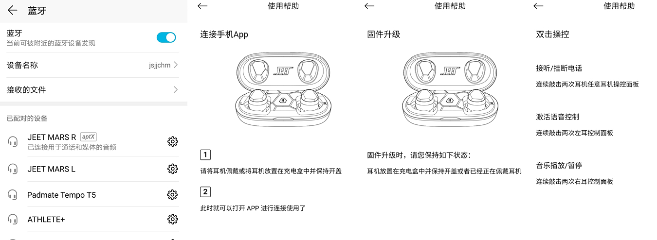 在蓝牙列表中可以清楚看到,开启aptX模式会有图标显示。JEET MARS无线蓝牙耳机支持APP固件升级以及音效模式更改,对于听音乐比较“讲究”的朋友可以在APP中自由选择。除了常用的接听电话模式外,支持语音助手唤醒,由于自己使用的安卓手机,在语音唤醒上是没什么问题,激活响应速度也很快,至于苹果Siri,官方称也是支持的,包括音乐播放切换等指令操作。