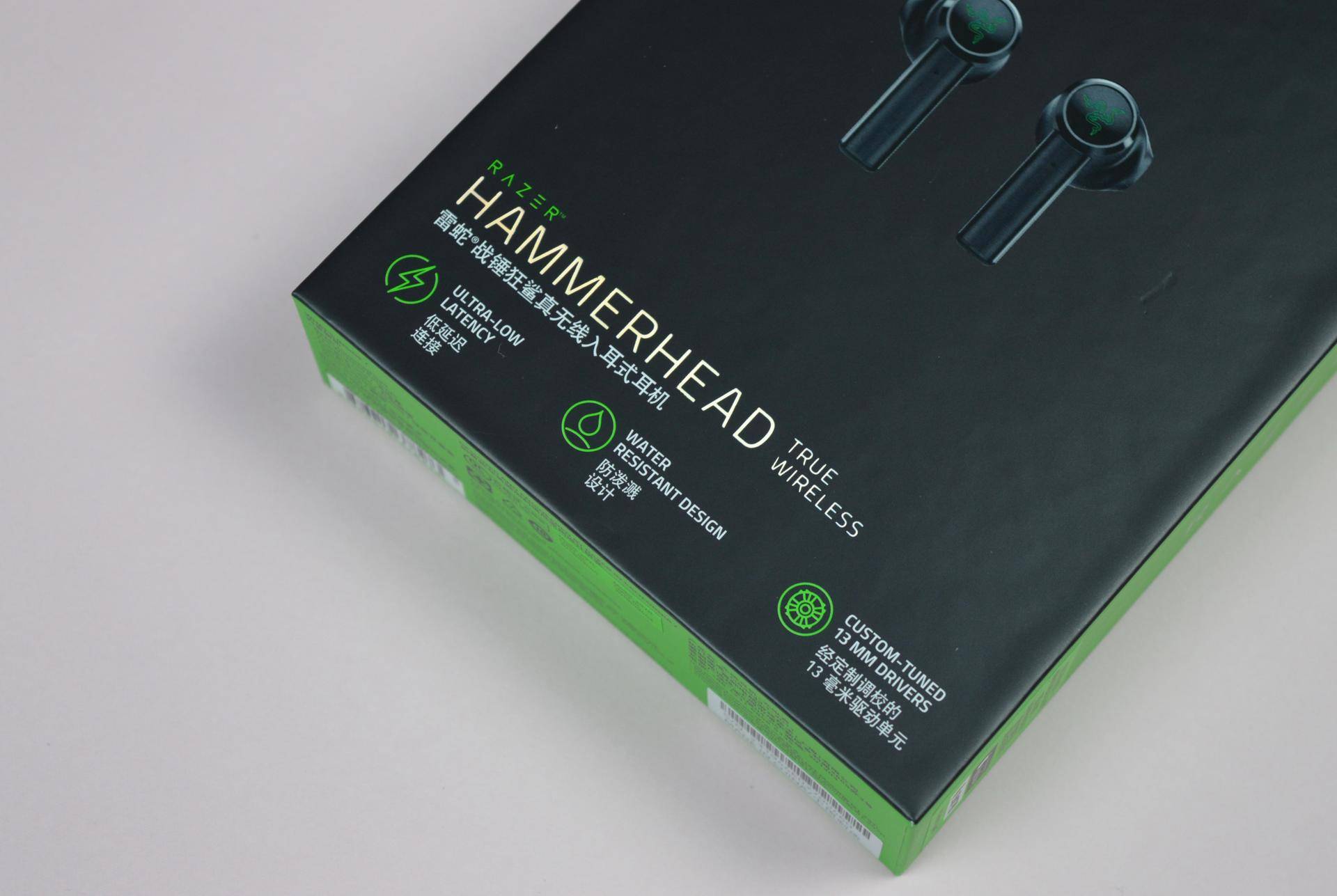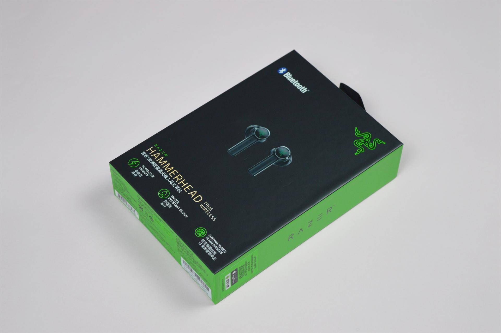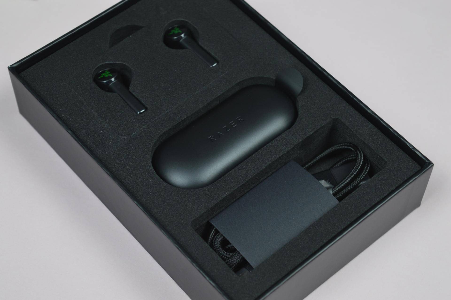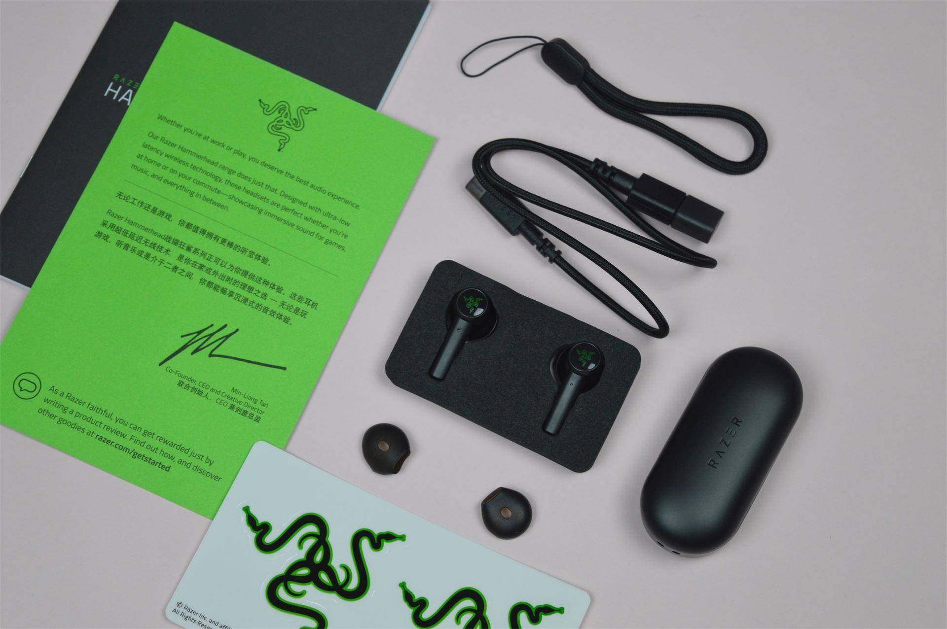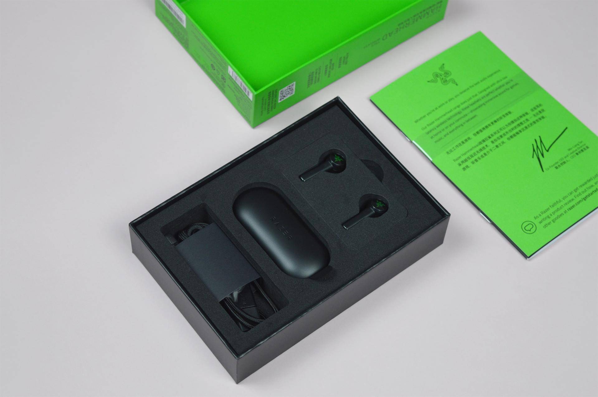 开盒后,耳机和充电仓及配件被妥帖的保护在黑色海绵固定物上,雷蛇惯例的致用户信和贴纸也非常有仪式感。