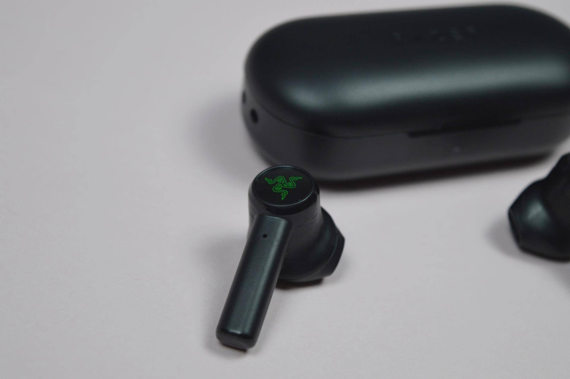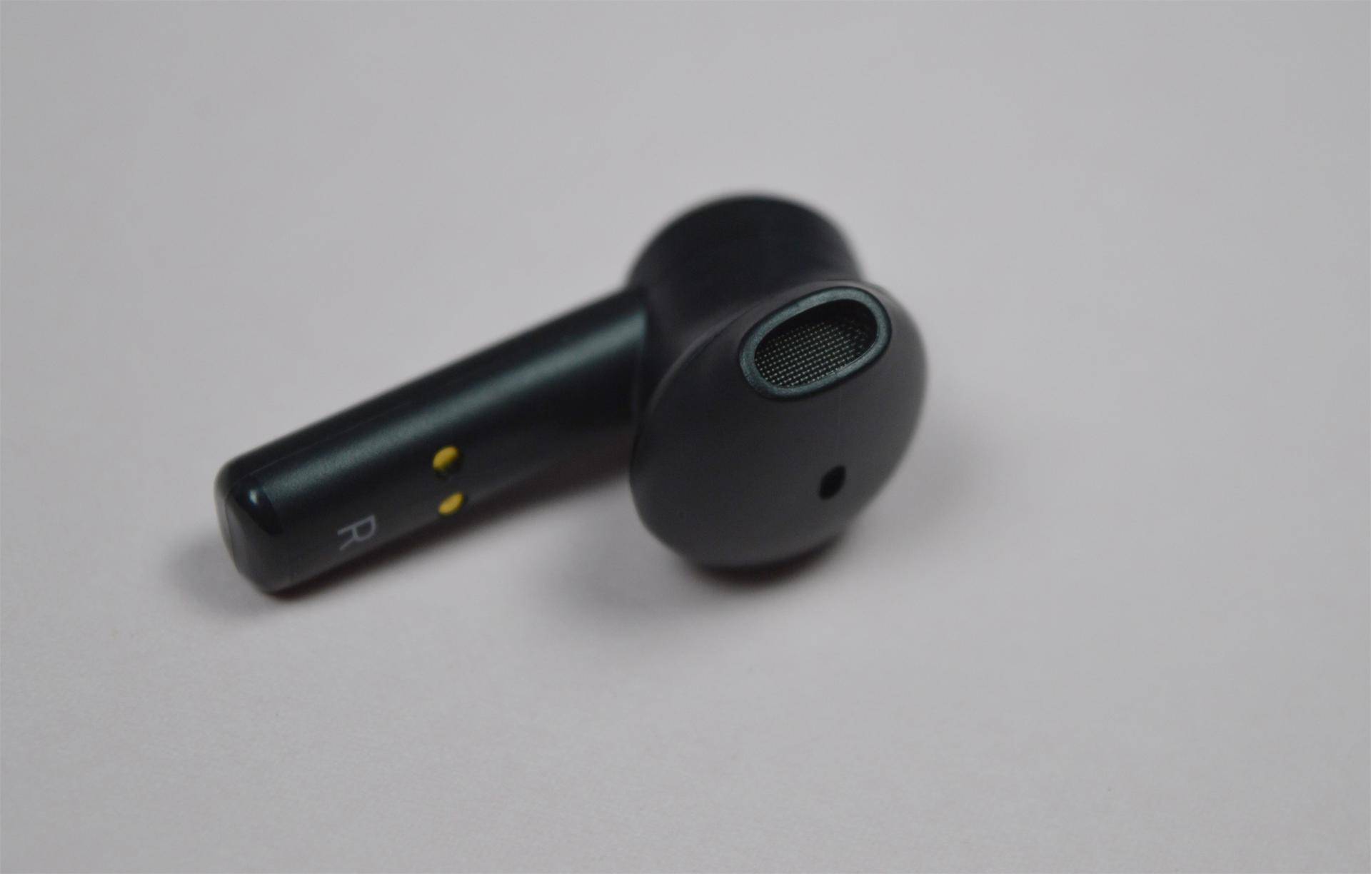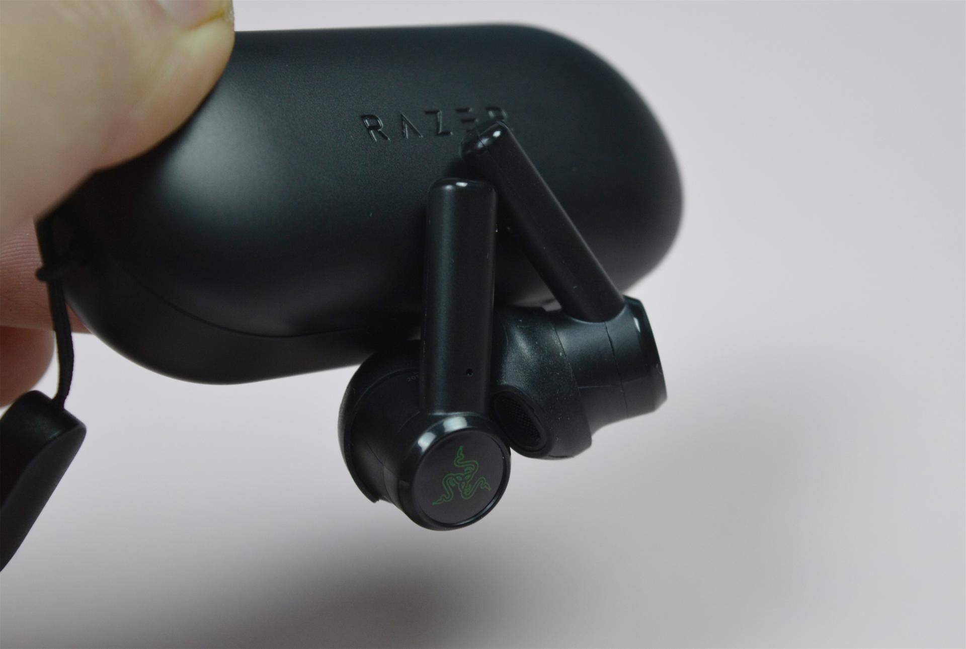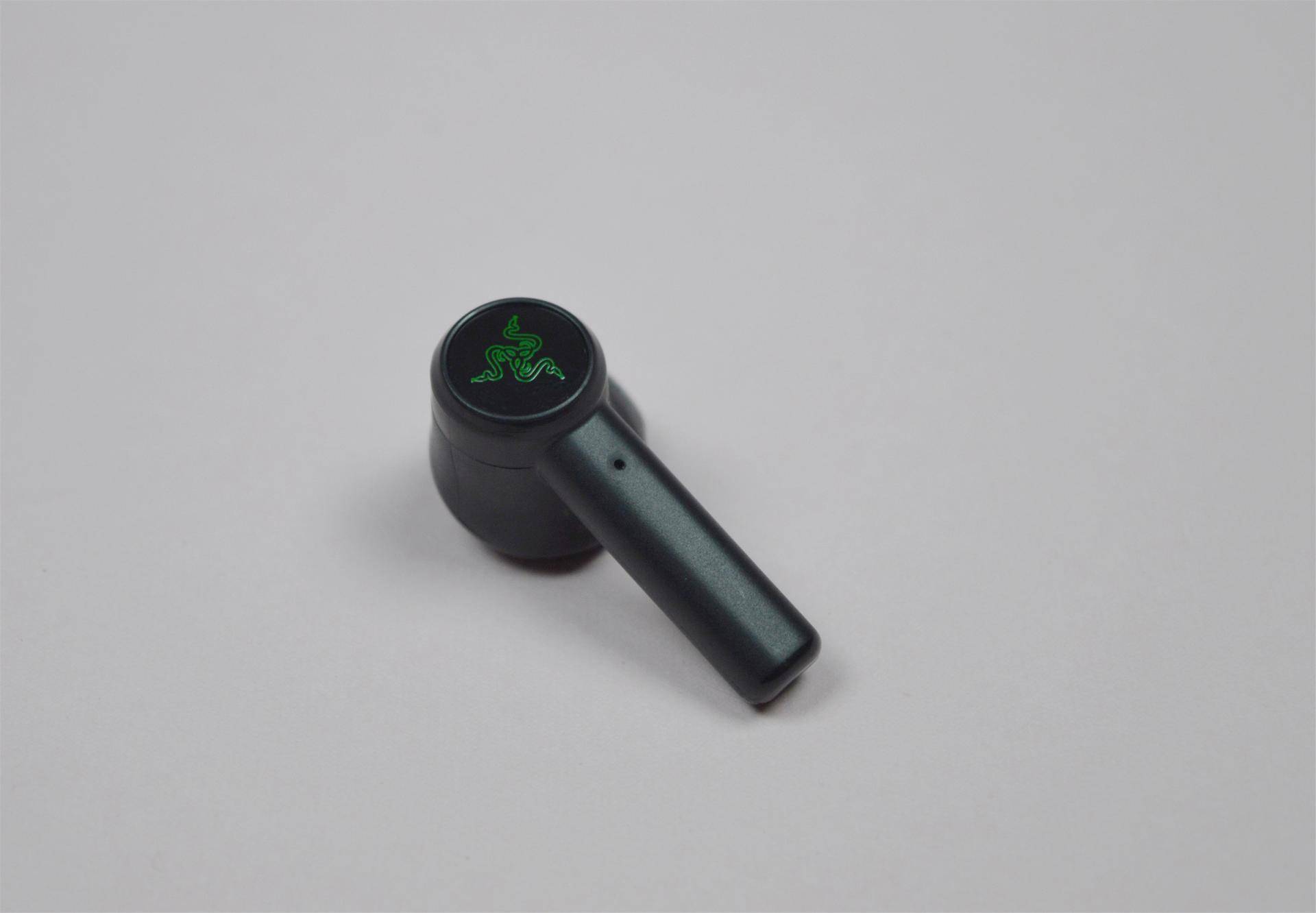 耳机表面采用了磨砂塑料材质,触感细腻中带点颗粒感。外腔体绿色的雷蛇logo,搭配一圈黑色亮片,在4.5g的单只重量下也显得非常有质地感。
