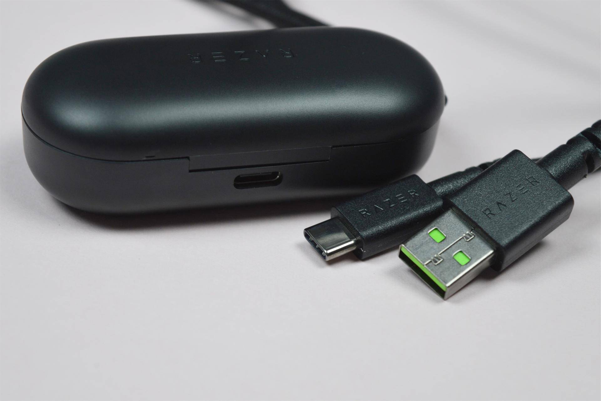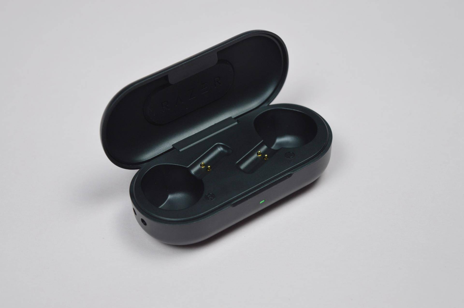 纯黑的充电仓比较简约,顶部可以看到雷蛇的logo。正面做了开合小槽,在使用的时候比较方便,单手开闭可以很自然的完成。开口下边是一个led指示灯。绿、橙、红分别表示电量充足、需要充电、低电量。