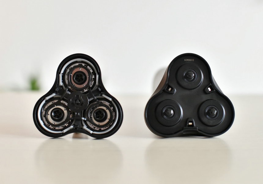 在剃须刀的使用清洁方面,抠住剃须刀头拆卸口可将刀网查下,能够看到里面的三个动力头,设计光滑无清理死角,所以使用后比较容易清理里面的胡须残渣。