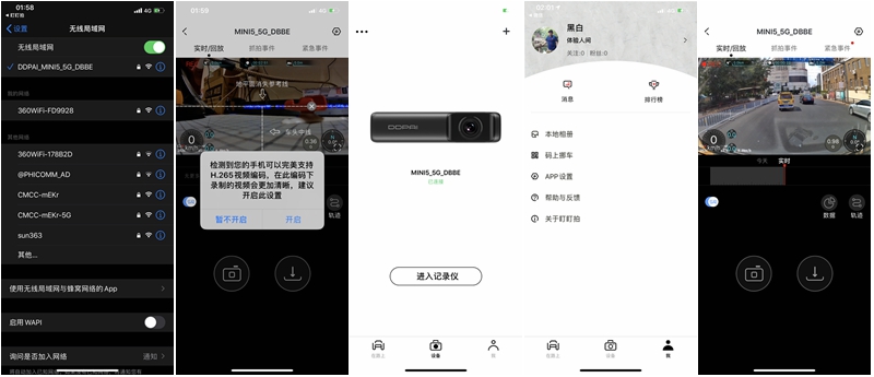 ▲盯盯拍app在各大应用市场中搜索即可,安装好后选择无屏记录仪,在不安装盯盯拍mini5的4G底座时,需要手机距离记录仪尽量越近越好,盯盯拍会发出一个wifi信号,在手机的wifi中点击即可连接,本款记录仪可实现两种图传,第一是近距离连接盯盯拍发出的信号连接,第二是搭配4G底座,远程进行回看下载回放。app中还可以进行系统的设置,分辨率、编码、时间水印、速度、音量和画面翻转等。我们可以看到,盯盯拍MINI5行车记录仪支持H.265视频编码,同时【监控】