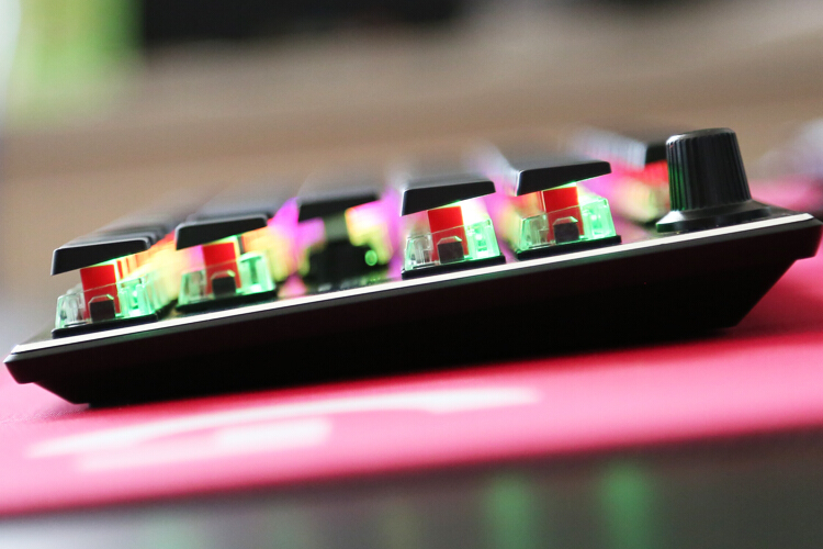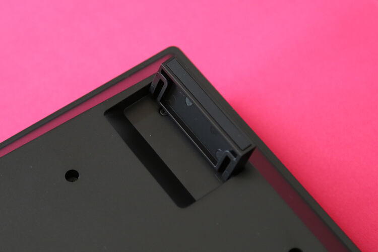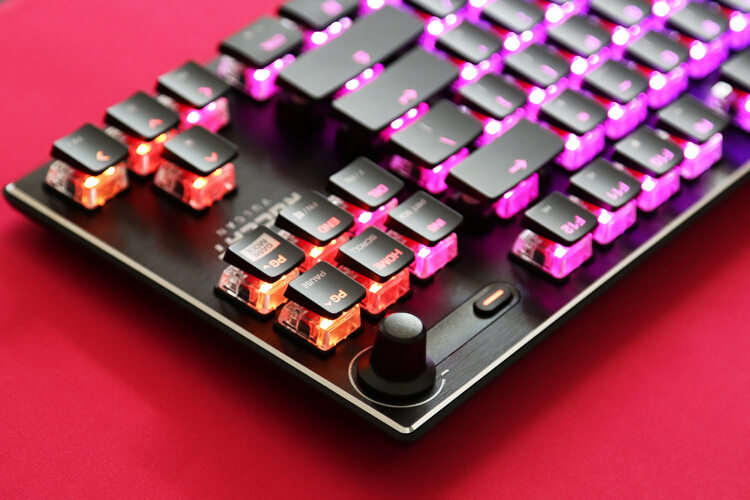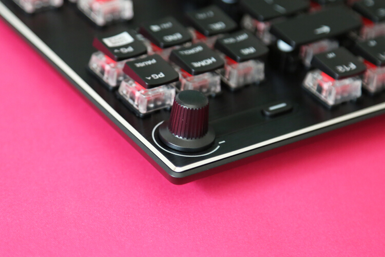 虽然是80%配列,右上角依然设计了音量旋钮和静音按键,这个设计原版上就备受好评,细腻塑料材质加之调音台旋钮的刻度感,让人时不时就忍不住想摸一下,如果这里透明设计也能亮灯就更帅了。