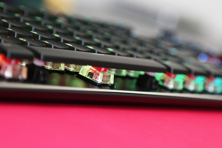 亚光超薄ABS键帽搭配键盘非常漂亮,带有内凹弧度,字体较粗,透光性非常好。因为轴座较大,所以仅兼容小部分MX键帽。