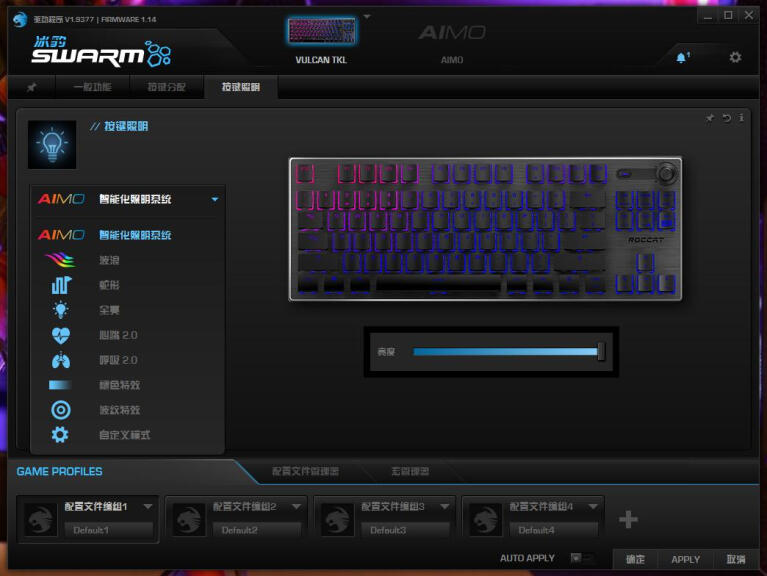按键照明页面,左边是灯效模式选择,有AIMO、波浪、蛇形、全亮、心跳2.0、呼吸2.0、褪色、波纹8种,以及自定义灯效。全亮-波纹灯效还能对键盘5个分区单独设置颜色,自定义模式可以对不同区域或不同按键设置单独颜色、效果、速度和亮度。