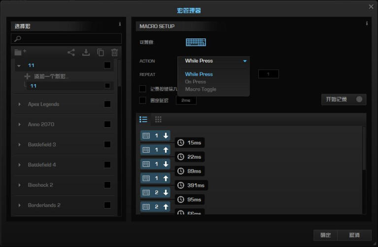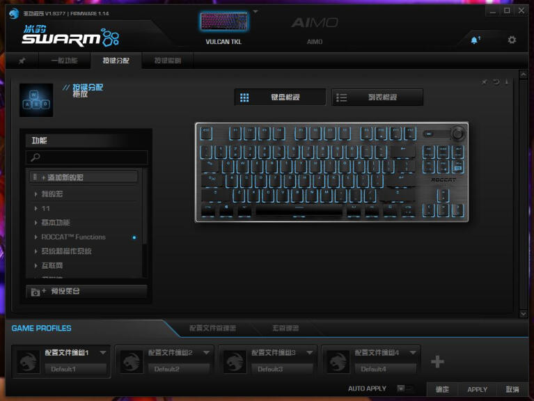 按键分配页面,主要有宏命令设定、按键重定义、easyshift+功能及宏功能设定等等。透过宏管理器除了可以编辑自己所需的功能,也能从官方预设针对各种不同程序、游戏的宏中套用。Fn 组合键及 Game Mode(游戏模式)都可以在此页设定,每一个按键都可以设定第二套不同的按键,其中主键区1-5、Q-T、A-G、Z-B共20个键还支持easyshift设定组合按键或宏命令。