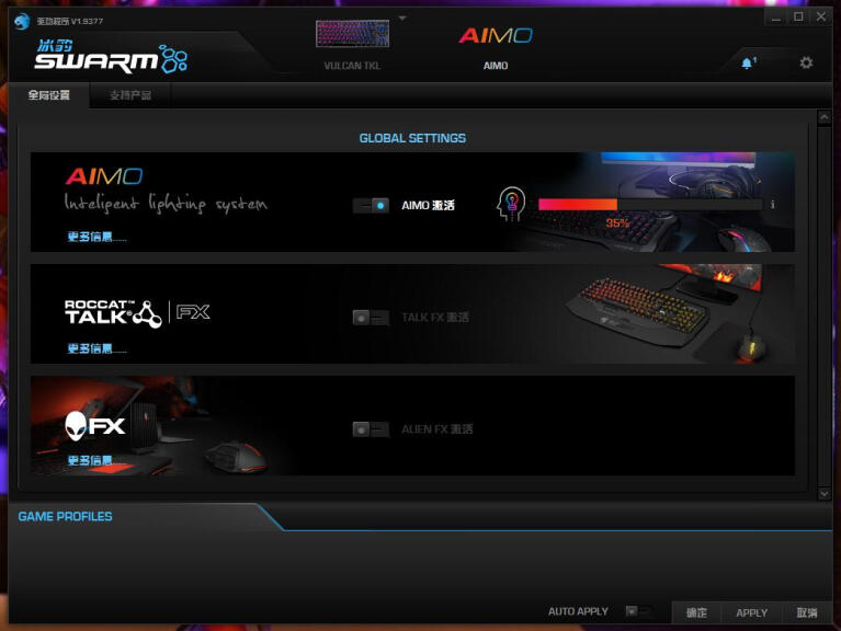选择Aimo灯效时,默认是一个变色的球体灯效在整个按键区跳动,按压按键,灯效除了会跟着改变外,持续按压的话,颜色会扩散到整个键盘,此外在调整音量旋钮时整个按键区会变成一个大进度条的灯效,非常的有趣。