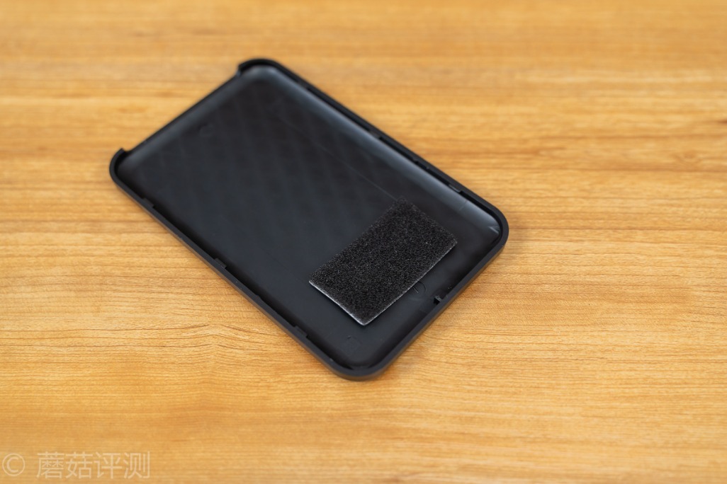 硬盘盒内部还附赠了一个泡棉贴纸,顶着内部的机械硬盘,防止机械硬盘晃动,还能吸收一些机械硬盘运动时的震动噪音。