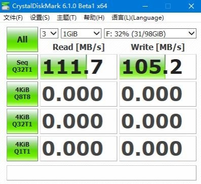 ▼换个DiskMark再试试,读取111.7MB/s、写入105.2MB/s,速度表现还可以。