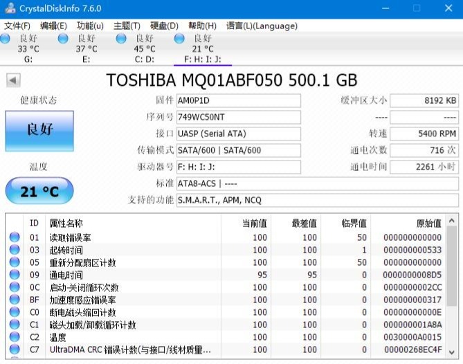 ▼简单看下硬盘的信息,通电时间2261小时,通电次数716次,用了好久的笔记本机械硬盘了。