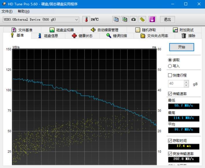 ▼简单跑个读写测试,读取108MB/s、写入91.8MB/s,速度表现还行,符合5400转笔记本硬盘的平均性能表现。