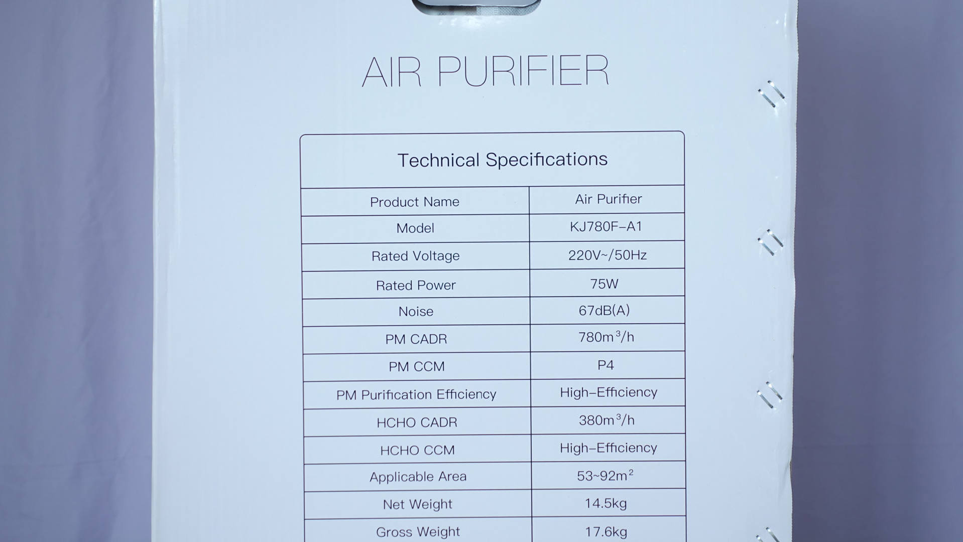 在产品包装的侧面技术规范描述,其中有产品名称、产品型号、额定电压、额定功率、噪音、PM CADR、PM CCM、PM净化效能等参数,不过在这些技术规范描述都是英文注释,对于英文不好的同学来说,读起来稍微有些麻烦。