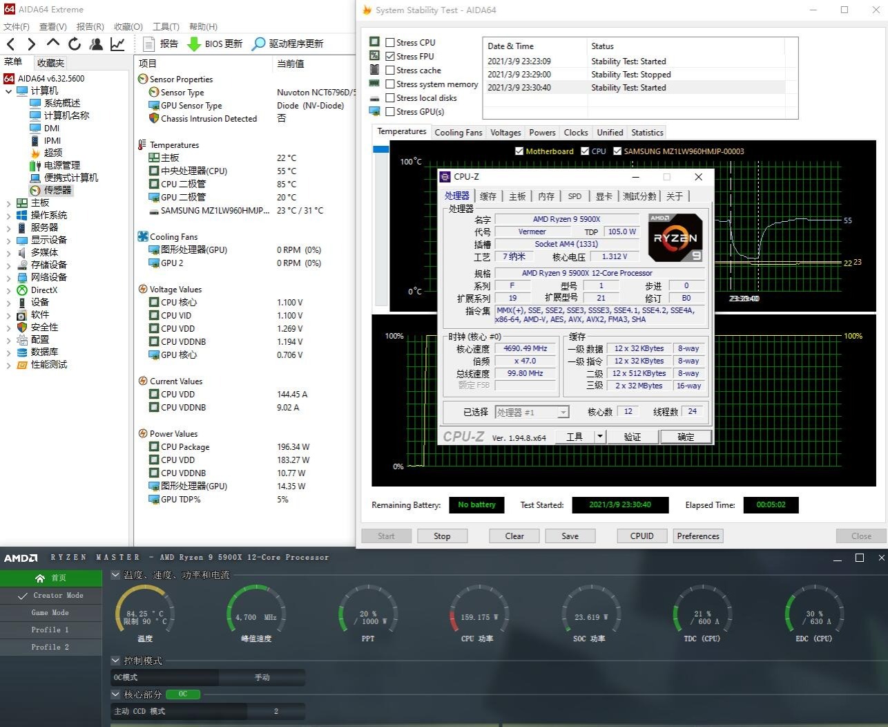 一、前言现在处理器的性能都非常强劲,规格也十分给力。当然,和这个性能、规格相匹配的,还有夸张的功耗和给力的散热。功耗方面的表现其实还好,主板加强供电,电源的瓦数选大一点,CPU辅助供电都插齐就没问题了,但散热方面的却不是太好解决。由于工艺制程的进步,处理器内部的晶体管数量变的越来越多,但是体积却越来越小,继而直接导致接触面积的减小。发热增大,接触面积减小,自然处理器的发热就给人感觉突然大了不少。面对这样的问题,我们只能选择一些更加给力的散热器。风冷这边就是加热管、加风扇,结果就是体积和重量都上去了,不仅在机箱内部需要占用很大一部分空间,而且还会增加主板的负担。水冷这边倒是没啥,还是之前的120、240、280、360几种冷排规格,但是水冷的价格是要平均高于风冷的,因此,选择一些高性价比的水冷,或是普通用户的最优解。二、超频三巨浪360pro水冷 开箱▼超频三的水冷的性价比就很高,特别是这个新款的巨浪Pro系列水冷。包装正面印着水冷的彩印,下部是型号和介绍,右上角有硕大的350W的字样,有点夸张的。▼包装的背面介绍了水冷的相关信息。▼水冷的包装还可以,内部是泡沫加瓦楞纸,水冷的配件都卡的很牢固,外面都套有塑料袋,防止刮蹭。▼除了水冷主体之外,还有三把风扇和冷头扣具以及一些线材。三、超频三巨浪360pro水冷 外观▼水冷的外观看起来还可以。▼冷头顶部的发光面积很大,中间有超频三的LOGO。▼冷头的体积表现还行,侧面看着是圆柱形的。▼侧面有水冷管的进出水部分,弯头是独立的元件,水管的接口部分都有相应的加强,看起来很结实。▼冷头底部是大面积的铜底,表面有抛光处理。▼水冷管很粗,外面有编织网保护。▼冷排就是普通的360冷排,水道有12道,冷热个6道。▼水冷排的进出水部分也有加强设计,另外水冷排的两侧并未有金属包裹,看样是为了更好的散热而舍弃了一些装饰。▼冷排风扇挺漂亮的,中间的扇叶是乳白色的。▼四角有减震的脚垫和加强筋,风扇的骨架部分还有偷空设计。▼风扇的背面有铭牌,风扇额定输入DC12V 0.4A。四、超频三巨浪360pro水冷 装机▼蘑菇准备用这款水冷来压5900X,因此需要准备AM4的扣具配件。▼将冷排风扇固定到冷排上,然后将冷头部分的扣具也安装好。▼接着配合背板,就能将冷头牢牢的固定到主板上,安装过程还是非常简单的,拧上四颗螺丝就行了。▼机箱是安钛克的风行者DF700,机箱上部支持安装360水冷,蘑菇就把水冷安装在机箱上部,朝外排风,辅助机箱内部风道的建立。▼电源选择安钛克的NE850金牌全模组电源,电源的长度表现很不错。▼电源安装完成,并把各个部分的供电都插好。安钛克风行者DF700这款机箱的电源仓侧面还有开口,方便将电源侧面露出来。▼接着安装内存,扎达克的SPARK,8G*2 3600MHz,内存的马甲特别漂亮。▼安装好之后的效果,内存的灯带是多段式的,顶部是连贯的,很有设计感。▼接着安装显卡,索泰的RTX3070 PGF,这款显卡还是非常空气的。▼空气的侧面有索泰的LOGO,LOGO部分还有灯效设计。▼索泰的PGF系列显卡都是定制的顶级非公卡,显卡的重量很给力,这里顺手塞个显卡支架,在显卡尾部给显卡提供支撑。▼整机效果,看起来还是非常不错的。▼开机,一次点亮,完美!整机效果很漂亮,特别是水冷部分。▼水冷头顶部的发光面积超级大,幻彩的ARGB灯效很漂亮。▼靠近看看,水冷头顶部全部都是柔光材质,颜色看着很有质感,过渡部分很柔和。▼水冷的冷头和冷排风扇灯效是一样的,支持同步。▼如果机箱内部有其他的硬件也支持幻彩灯效,整体的效果会非常好看。▼冷排的风扇扇叶是乳白色的,也有柔光效果。▼关灯之后的效果,整机会更加酷炫一些。▼安钛克风行者DF700全部有大面积的金属冲孔网,搭配幻彩的ARGB风扇会有非常特殊的效果。五、超频三巨浪360pro水冷 测试▼整机配置一览,处理器是5900X,显卡是索泰的RTX3070 PGF。▼简单测试,整机跑分186W,处理器96.2W,显卡62.7W,非常给力。▼日常待机,室温18℃左右,处理器温度仅有25℃。360水冷就是势大力沉,待机温度都控制的会比普通散热低一些。▼简单跑个CPU-Z的压力测试,5900X全核睿频4.55GHz,功耗170W左右,处理器温度69.4℃。不超过70,轻度满载稳稳的。▼单烤FPU测试,5900X全核睿频4.47GHz,功耗195W左右,处理器温度83℃,整体表现不错。超频三的这款水冷可以应付5900X开PBO重度满载的工况。▼最后试试超频,将5900X拉到全核心4.7GHz,单烤FPU,处理器功耗200W左右,核心温度84.25℃。表现不错,超频之后的5900X依然能按住。▼超频之后,R20多线程跑分9197,成绩不错。不过单线程表现会略差一些,只有604。六、总结超频三这款巨浪360Pro水冷还是挺不错的,整体的性价比很高,颜值和性能表现也挺不错的,是一款性价比很高的360水冷,值得预算不高、但处理器发热不小的用户选购。水冷的外观很漂亮,水冷头顶部的发光面积很大,并且配有完整的乳白色柔光部分。通电之后默认有幻彩的ARGB灯效,可以和冷排风扇同步,同时还支持主板灯效同步。散热性能部分,巨浪360Pro可以轻松压住5900X,默频、满载包括超频,都可以把温度控制在一个非常不错的数据,整体表现不错。谢谢大家!The End