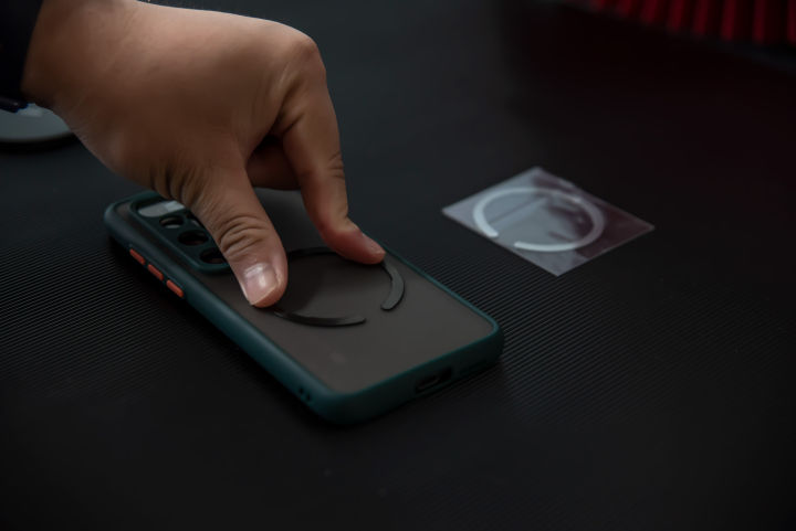 找到自己无线充电区域的位置后,撕掉巨磁环上的衬垫,将缺口部分朝向充电口部分,这时候时候使劲按压,过一段时间后就可以使用了。
