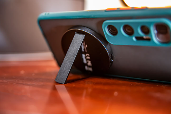 安装好之后,下面我们来上磁吸无线充电器。亿色磁吸无线充电器很人性化的加入了支架结构,并且他这个支架是有独家专利的支架。便于我们在充电的时候可以展开,我们可以边充电边刷视频。