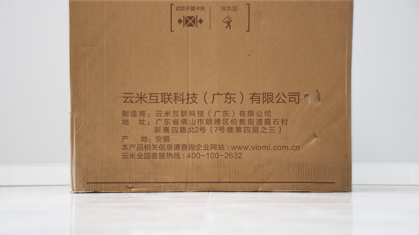 箱子正反两面内容基本一致,印有云米的Logo和产品名称,另外分别标记有“正面”和“背面”字样,在搬运的时候要稍微注意些。