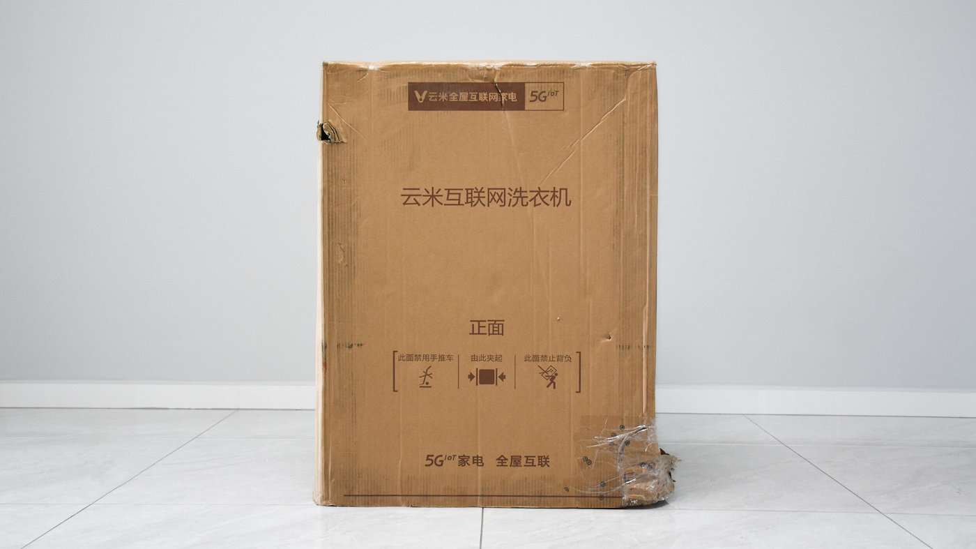 这台洗衣机采用传统的瓦楞纸包装箱,大件家电的包装方式比较方便开箱,剪掉扎带并向上把箱体拿开就好了。收到产品的时候箱子有些许破损,但箱内有厚实的塑料泡沫填充,产品毫发无伤。