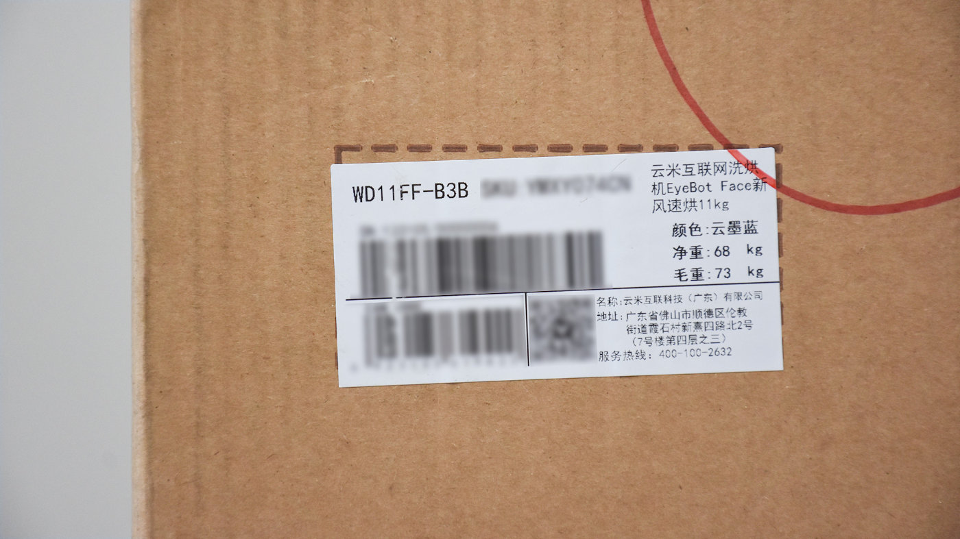 侧边靠上的位置贴有不干胶铭牌,标记有这台洗衣机的序列号、型号、颜色等参数以及制造商信息,便于在开箱前对产品有一个大概的了解,我选的这台是EyeBot Face新风速烘11Kg云墨蓝配色。