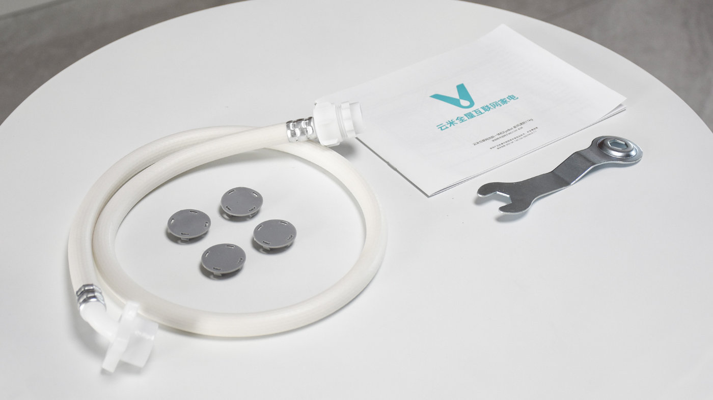 包装箱中除了洗衣机之外,还附赠有上水管、四个塑料塞、二合一扳手以及使用指南。