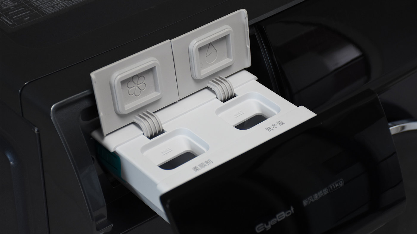 左侧是洗衣液和柔顺剂添加槽,盖板上标记有产品型号字样,稍稍用力向内按压即可弹开,推入后再次按压关闭锁住。柔顺剂和洗衣液分别有独立的添加口,并且有独立的盖板,防止液体溢出。