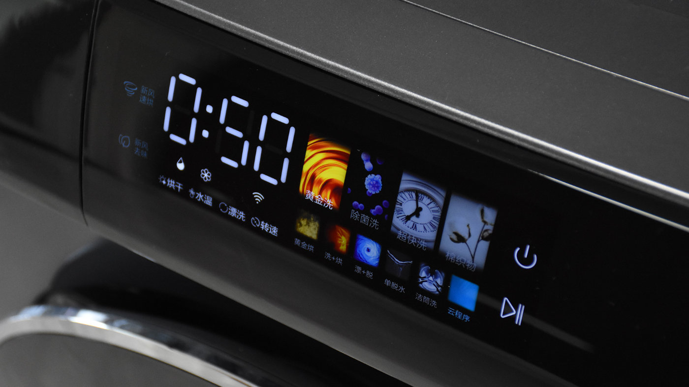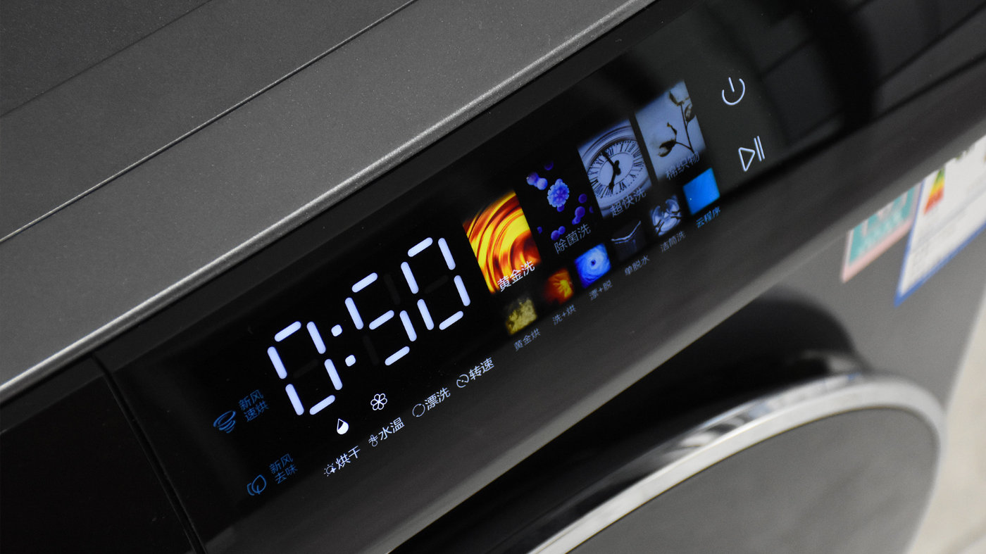 通电开机之后,交互区域的臻彩触控界面自动亮起,并伴有动画和彩色显示。触控交互的方式优势很明显,一方面代替了传统的按钮,避免按钮因长时间使用产生机械问题;另一方面背光打亮,即便是在光线比较暗的环境下也不影响使用;第三开启童锁之后能够避免小孩子无操作。