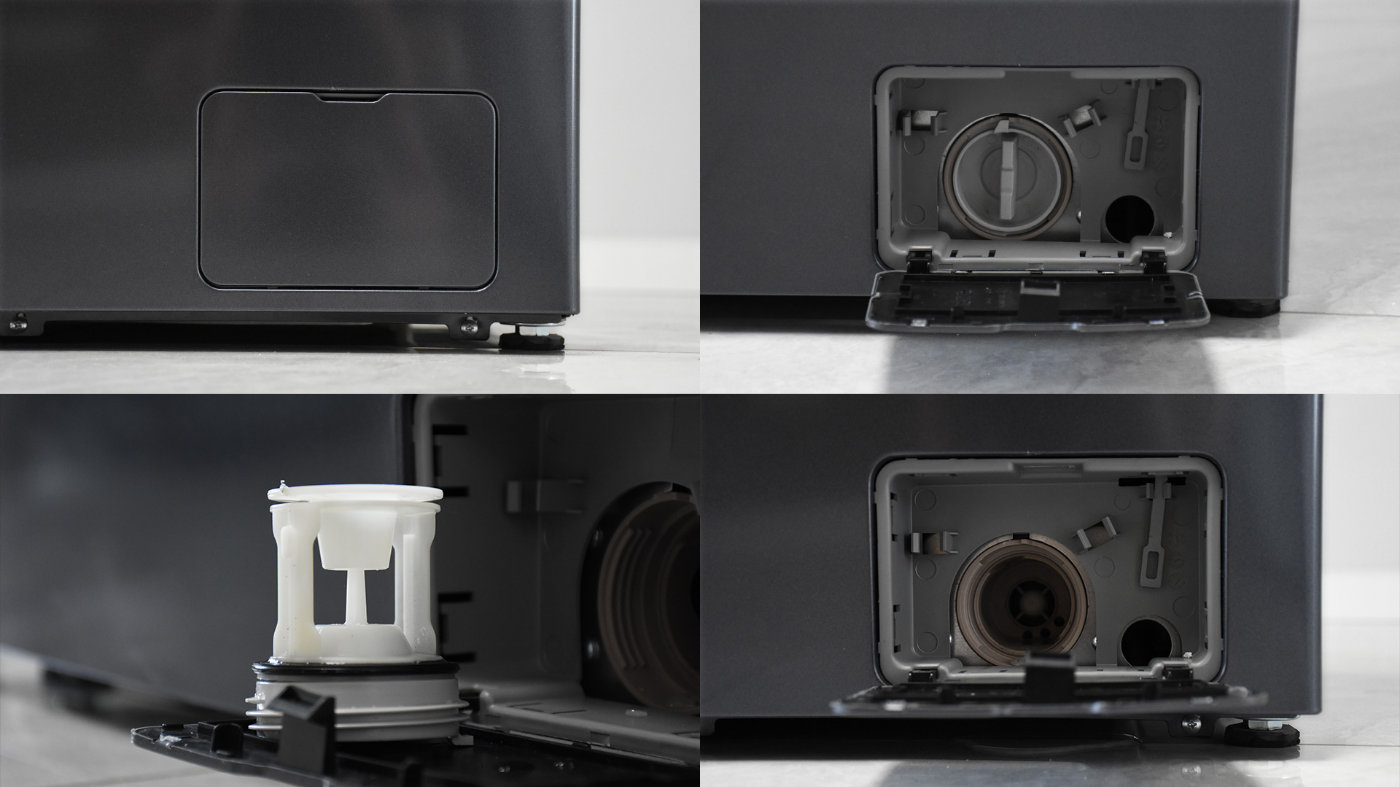 对应右下角的位置有一块装饰盖板,打开以后内置有排水泵,一旦洗衣机故障无法正常排水,就可以通过这里的应急排水口将滚筒里面的水排出来。