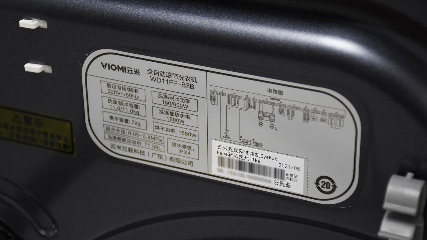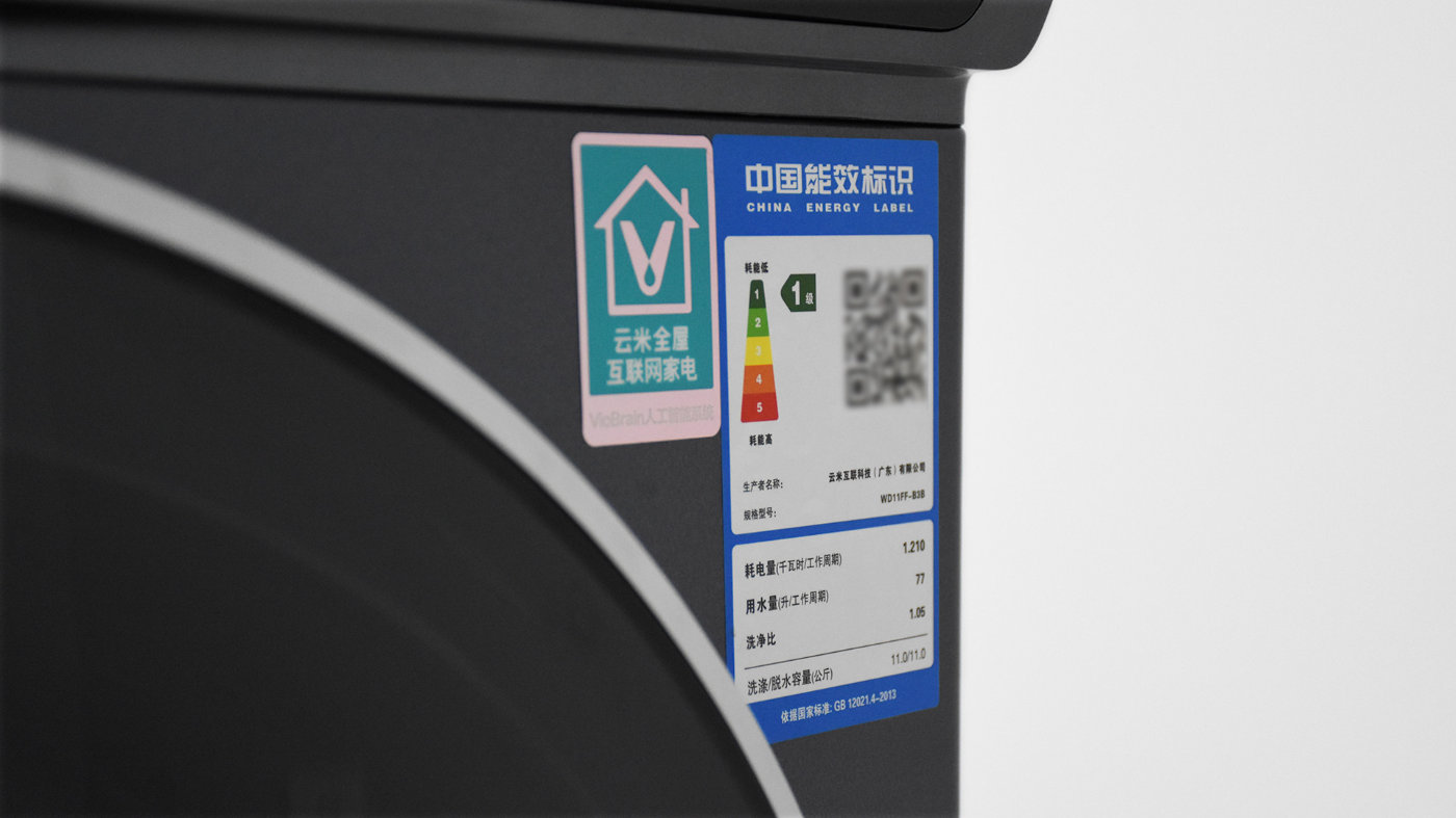 值得一提的是,在机身正面右上角贴着两块不干胶标签,分别是云米全屋互联网家电标签和中国能效标识的标签,这台洗衣机属于一级能效标准,洗净比为1.05。
