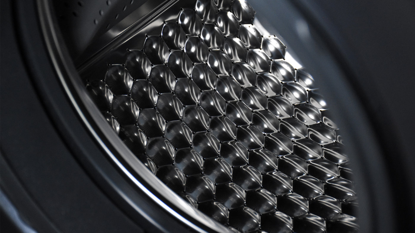 滚筒部分采用304不锈钢材质,且在表面设计有一些突出的小圆点和橡胶组件,主要作用是增加滚筒转动时与衣服的摩擦力。