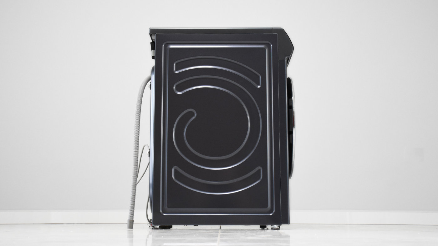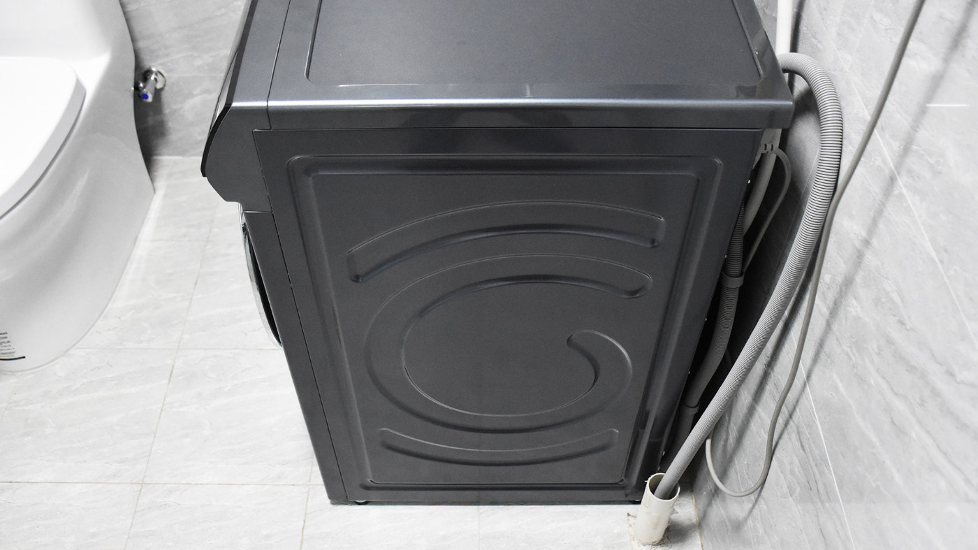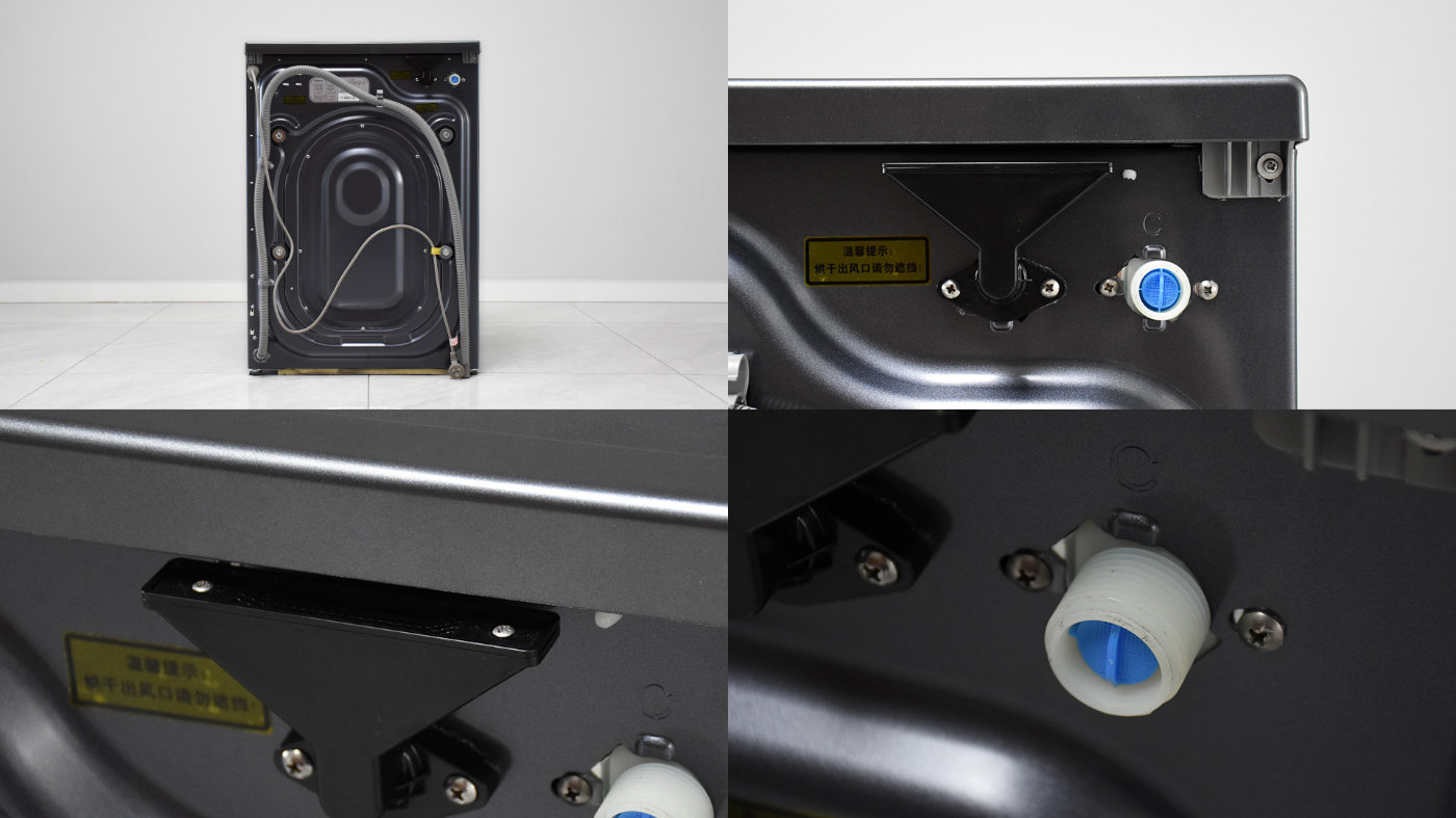 机身背部分布的模块比较多,不过安装以后靠墙放置,日常不会看到。背部的盖板根据机身内部零部件形态做了凹凸的造型处理,右上角黑色漏斗造型的是烘干出风口,从顶部向下看有出风格栅;旁边的白色圆孔是进水管接口。