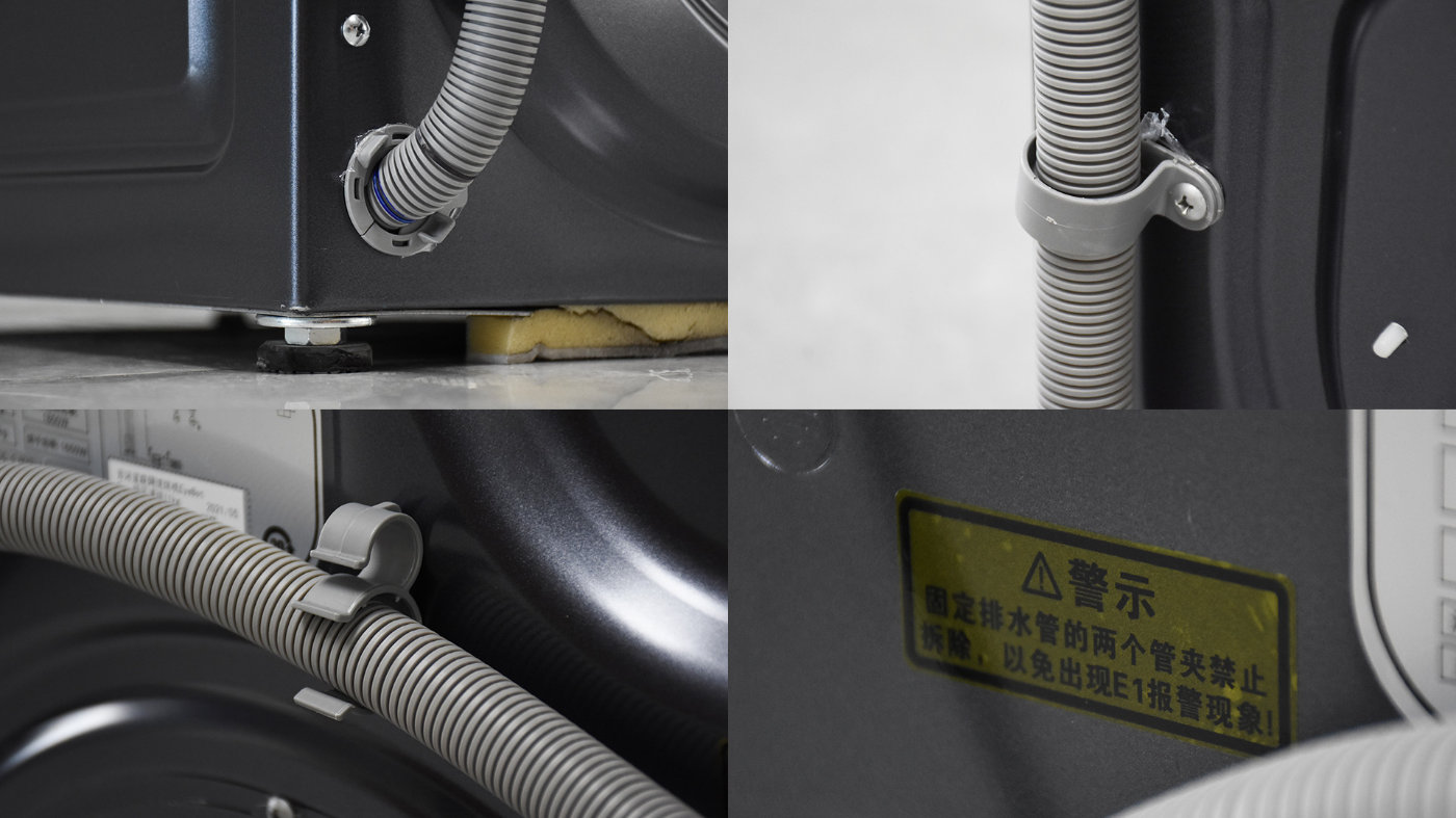 排水管从机身背部左下角向外延伸,通过两个管卡引导向上走,到右侧再垂下来,属于上排水的设计。靠右边的管卡可以取下来,如果家中排水管在另一侧的话可以调整方向。