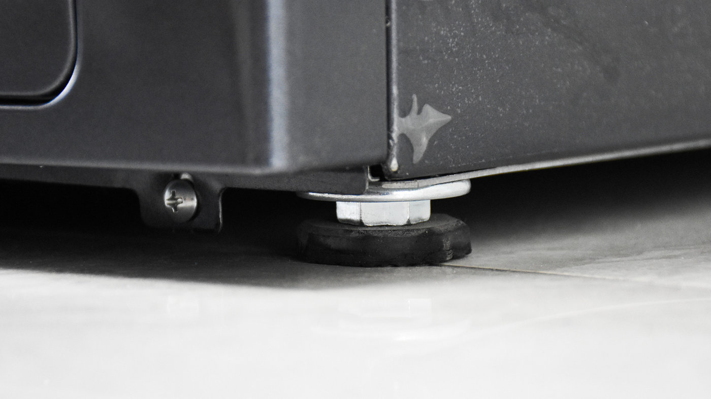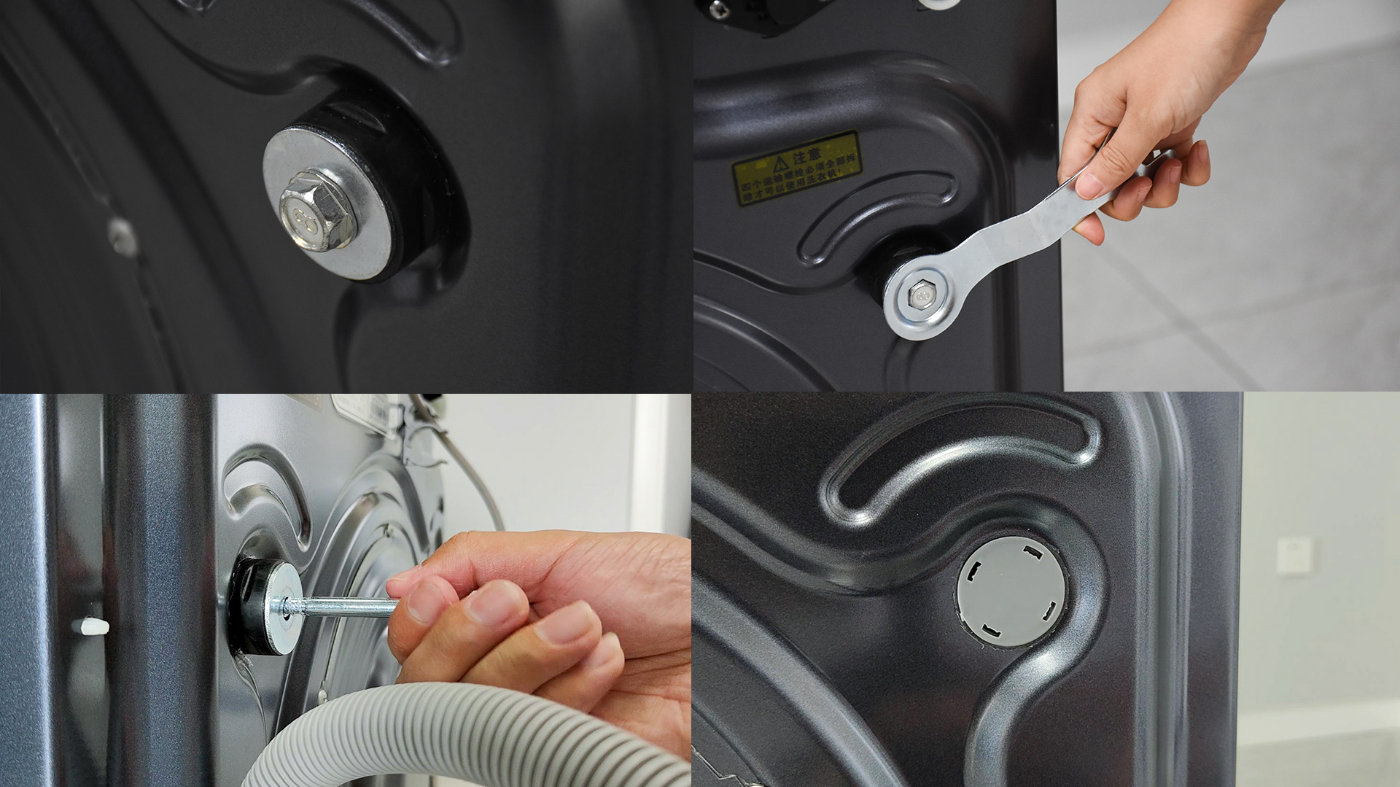 安装之前需要取下机身背部的四个运输螺栓,用附赠的扳手拧下来即可,然后将孔塞扣上去。如果需要重新运输的话,切记要把螺栓装回去再搬运,防止损坏机身内部。