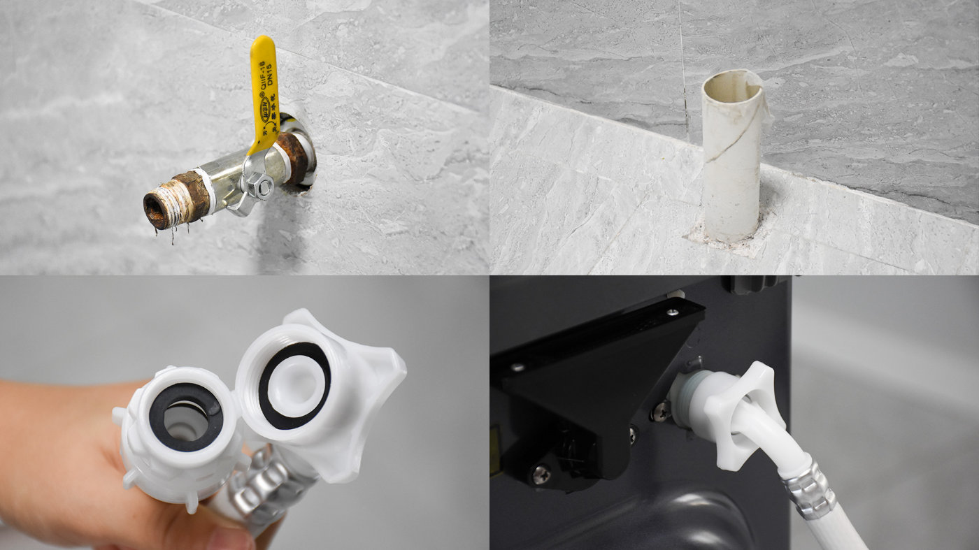 之后将洗衣机搬运到需要安装的位置附近,要确保附近有上下水管,一般做水电的时候都会预留。附赠的进水管一端是弯头,一端是直头,弯头的一端和机身背部的进水口连接起来,螺帽拧紧就好。出厂搭配有橡胶垫,通常拧紧以后不会漏水。