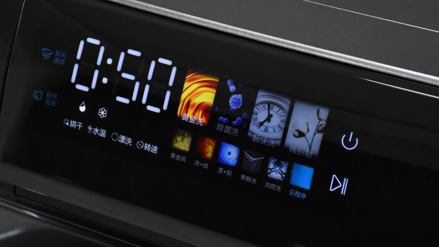 系统预设的洗涤模式非常丰富,在机身UI中包含有黄金洗、除菌洗、超快洗、棉织物,另外还包含有黄金烘、洗+烘、漂+脱、单脱水、洁筒洗等常用功能和组合功能,每一种模式都对应提供不同的程序、时间、水温、转速等等,详细的信息参见说明书。除此之外,搭配手机APP还支持解锁更多的使用模式,后面会详细讲到。