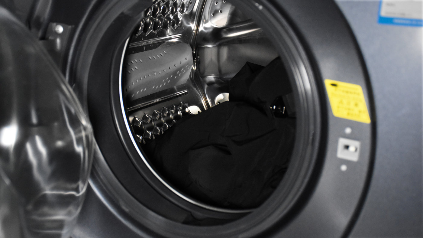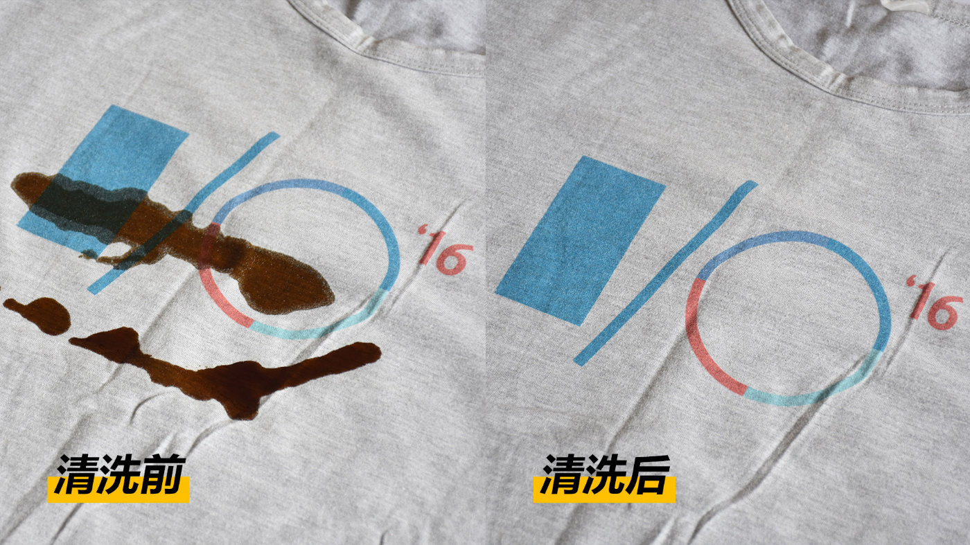 在体验期间我也做了更极限的测试,找到一件不准备穿的T恤,在上面倒上酱油,待酱油完全渗透到衣服纤维当中后,丢到洗衣机桶内。开启洗+烘模式,洗涤并烘干后拿出来对比,酱油部分的污渍已经完全没有了,可见洗涤能力还非常出色。