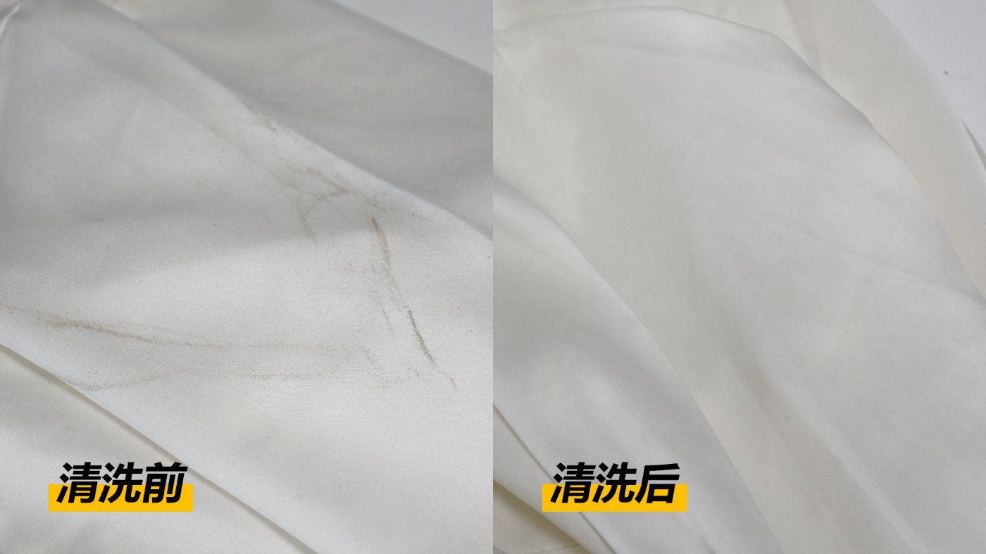 清洗结束后把衣服拿出来,经过脱水之后不会再滴水。检查清洗前有污渍的位置已经非常干净了,另外衣领和袖口的位置的汗渍也不见了。