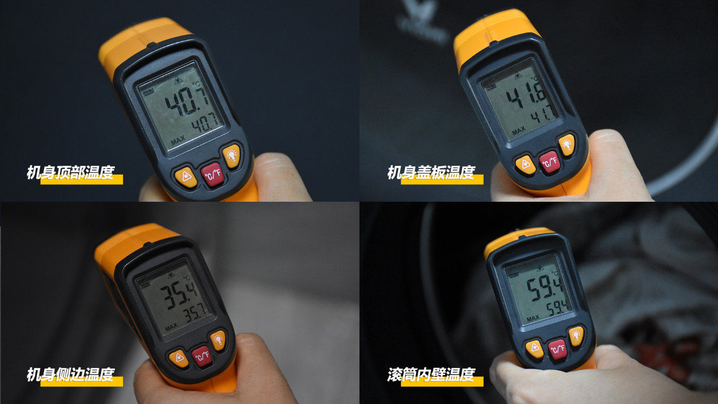 烘干完成后,使用温枪测试机身不同位置的温度。其中,机身机身顶部为40.7度,滚筒盖板为41.6度,机身侧边为35.4度,滚筒内部为59.4度。