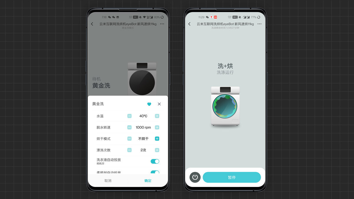 除此之外,云米EyeBot洗烘一体机还支持智能家居联动,不过目前只能和云米的产品实现联动,比如在云米冰箱的大屏幕上控制洗衣机,支持触屏界面操作和语音控制两种方式,或者是洗衣机结束洗涤之后自动降下云米电动晾衣架等。希望后续可以开放接入米家,实现更多的联动体验和玩法。