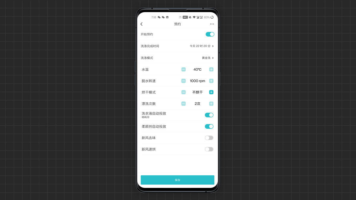 点击单个模式下方的设置小图标,进入到详细的设置选项,可以自定义水温、脱水转速、烘干模式、漂洗次数以及洗衣液、柔顺剂是否自动投放、开启新风去味和速烘功能等等。选择好以后点击下方的开始图标,洗衣机就开始工作了。